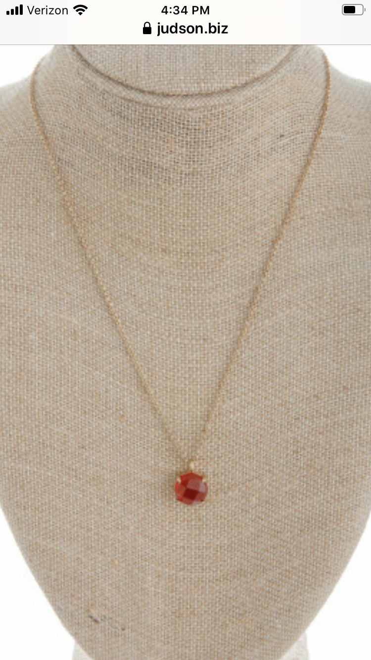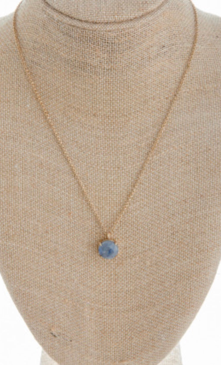 Long metal necklace with a natural stone pendant. Pendant approximately 1cm in diameter. Approximate 21" in length.