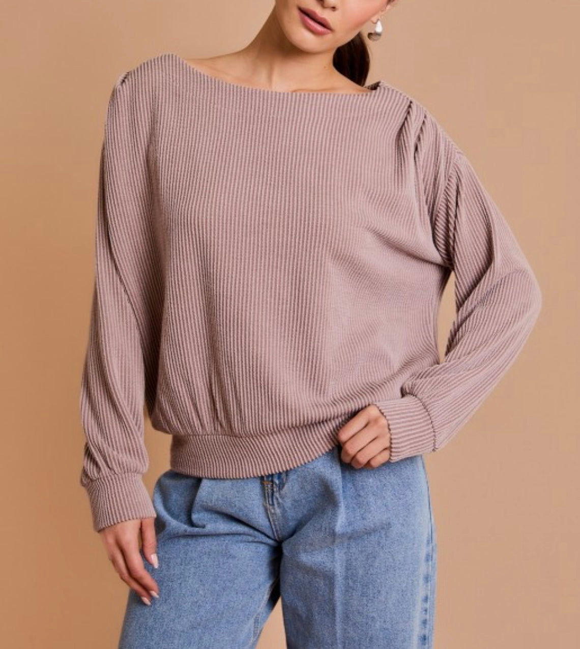 Textured knit top with boat neckline, ruching at shoulders, and banded cuffs and hemline. A great way to elevate your denim! Oversized fit.