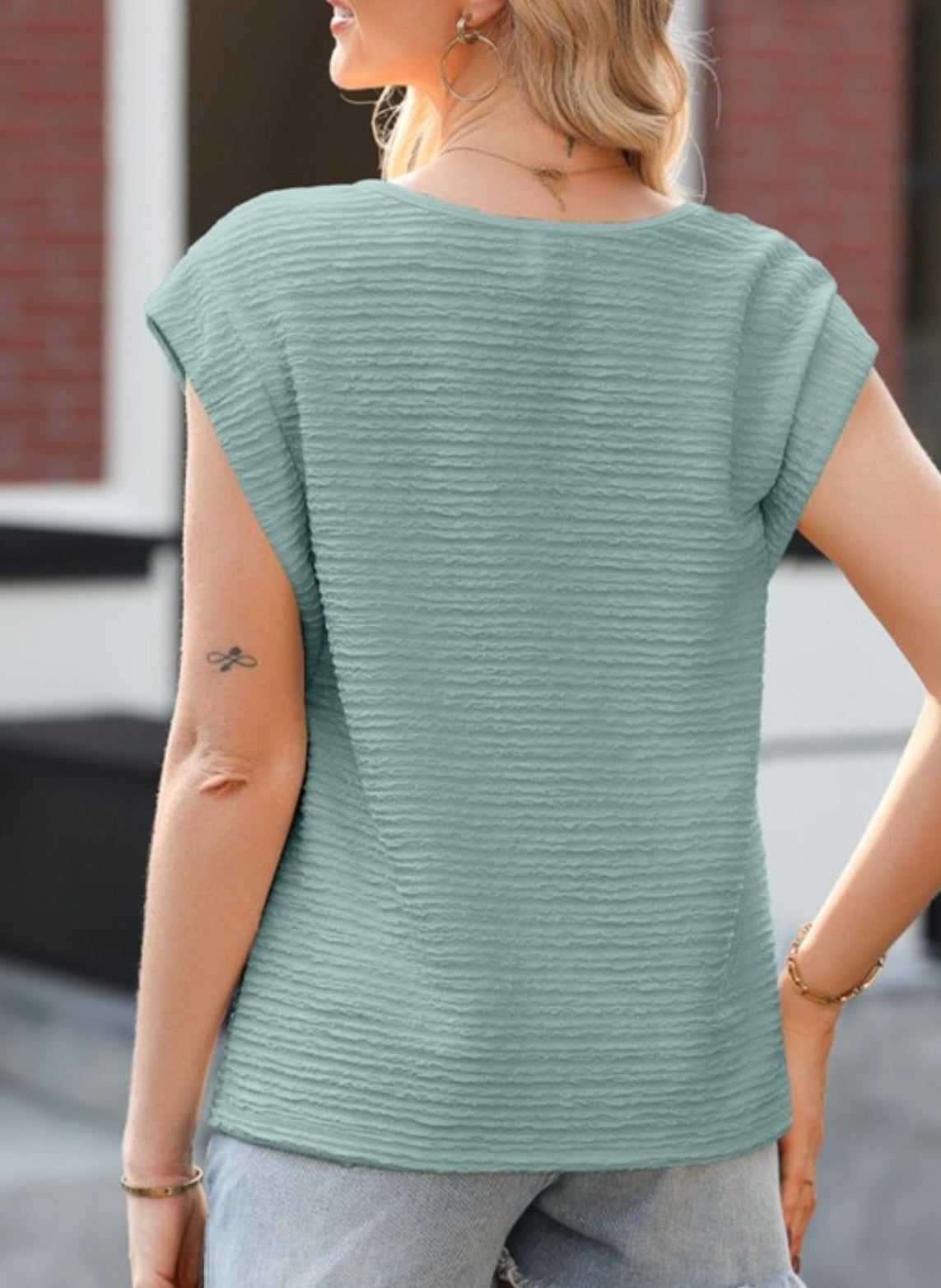 Looking for a top with a little more texture? Check out our Textured Cap Sleeve Top! It features an asymmetrical foldover neckline and cap sleeves for a unique touch. Oh, and did we mention it's made of cool fabric? So comfy!
