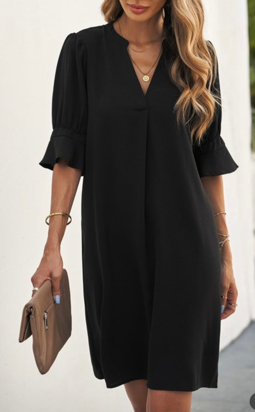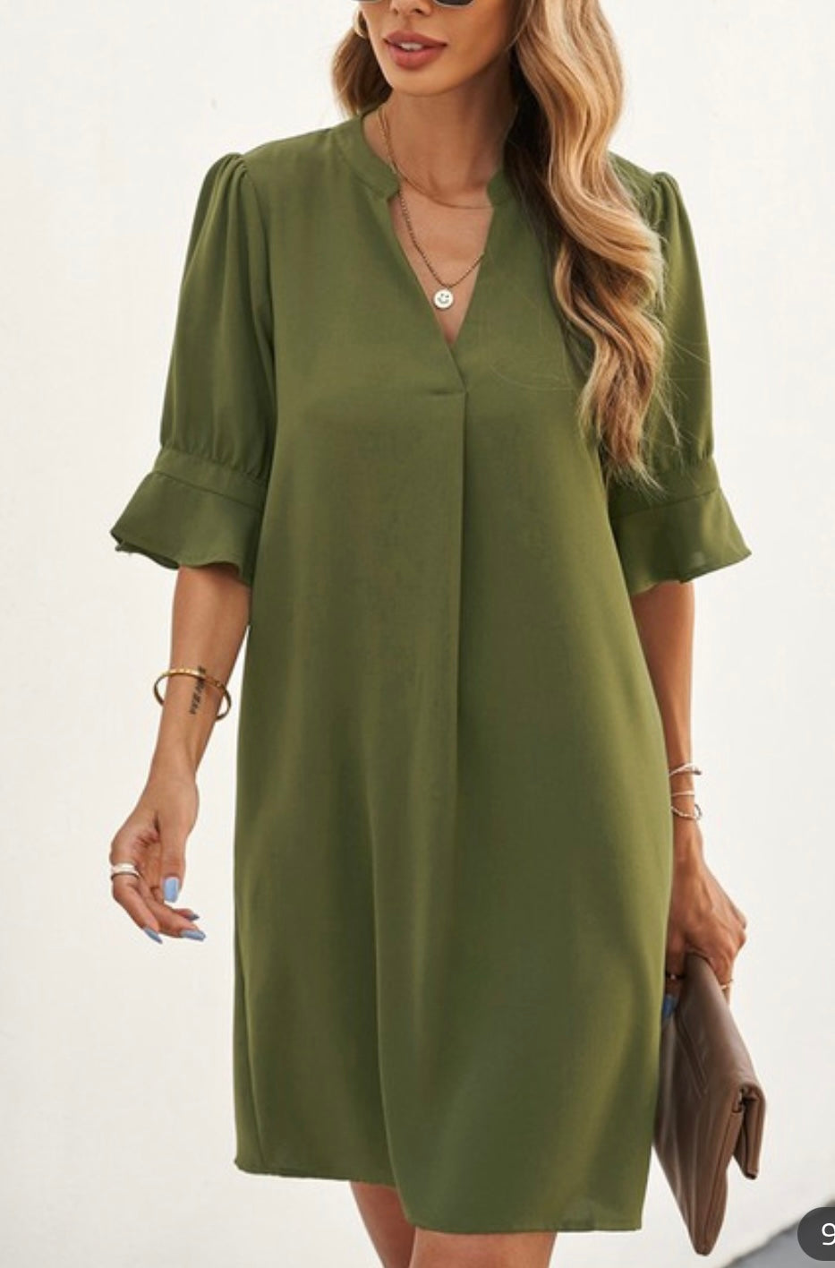 An elevated shirt dress that provides a flattering fit and easy style. Details include a notched v-neckline and bell sleeves. Unlined and non-sheer. Lightweight woven fabric. Fits in but true to size.