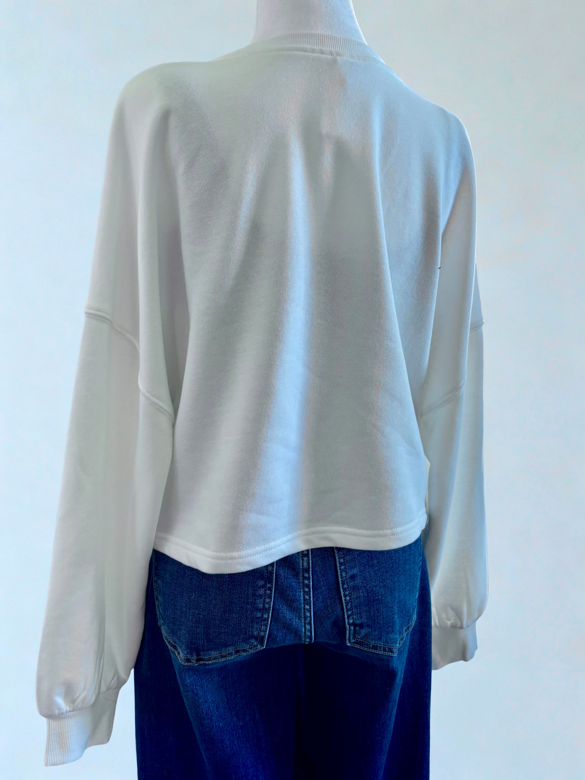 Cropped style sweatshirt with notched neck. Tinsel tree with stars on front. Soft and cute. Fits true.