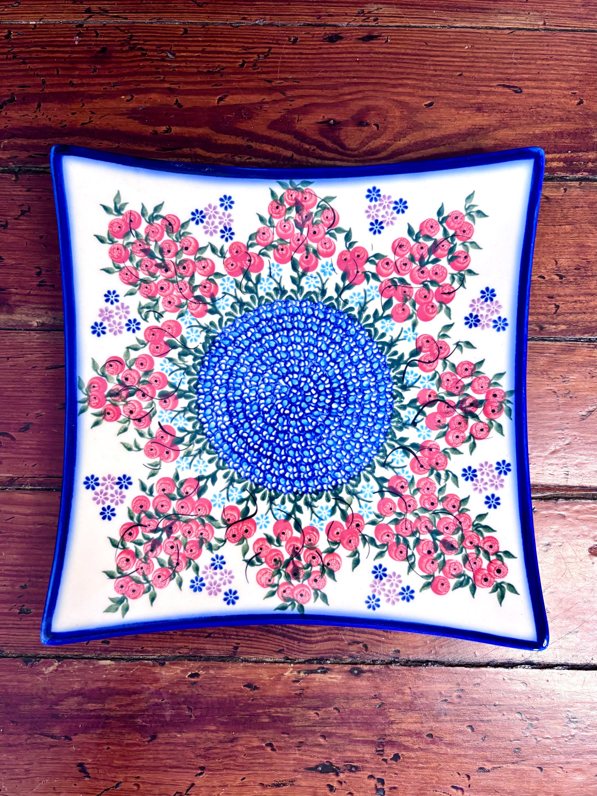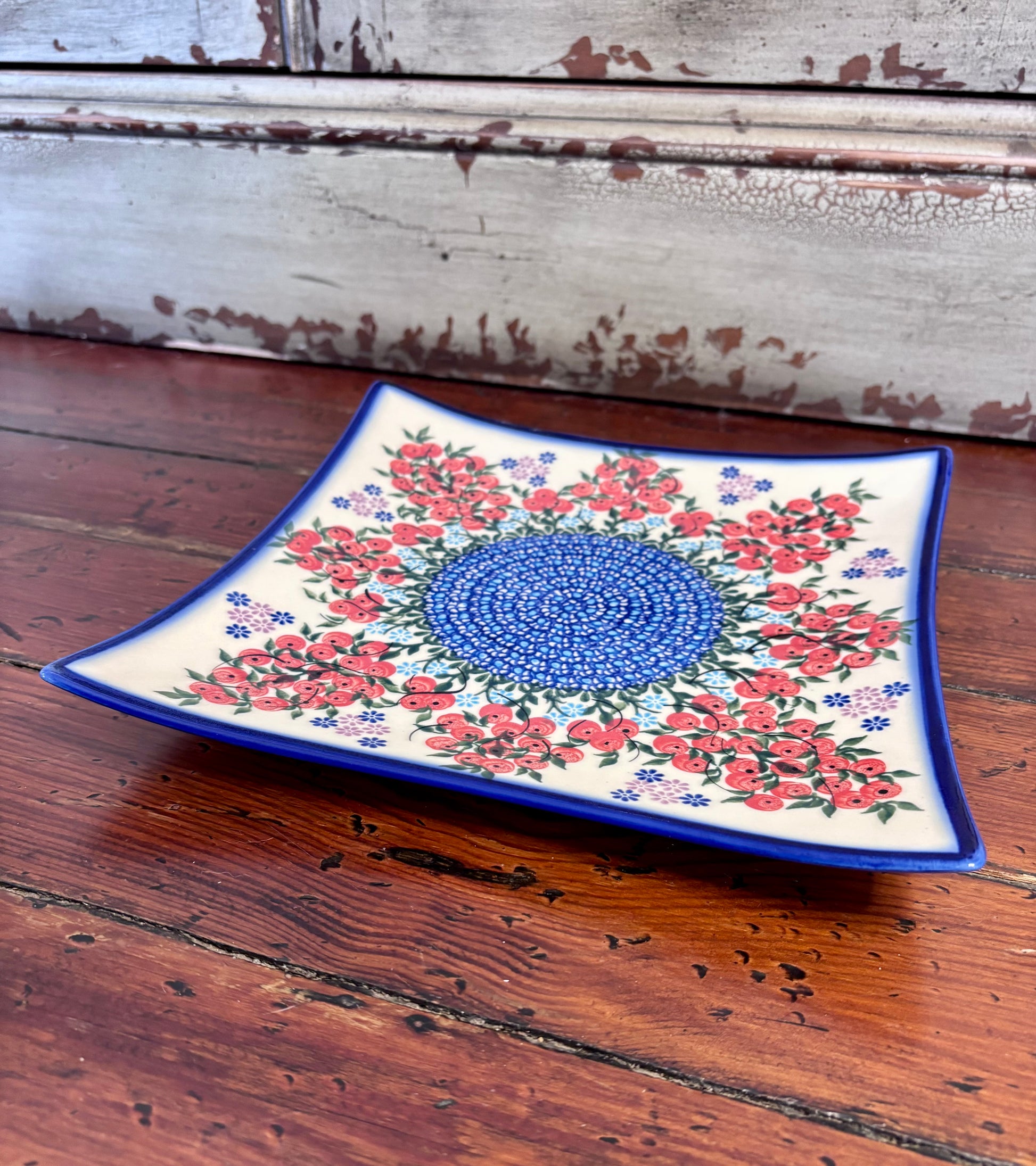Beautiful 10” square serving plate with slightly curved pointed edges.