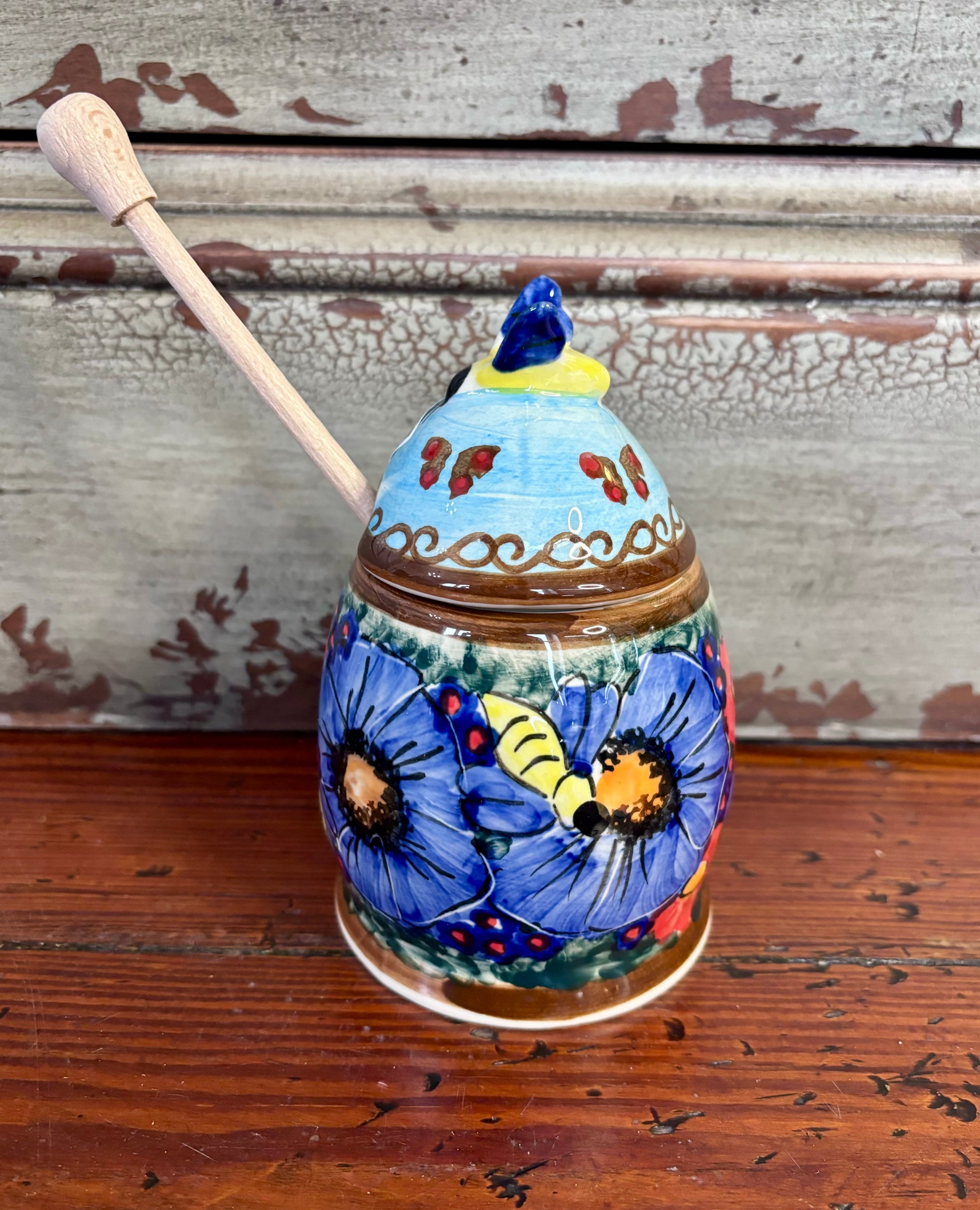 So ornate! This honey pot has raised details, a removeable lid, and a honey comb.