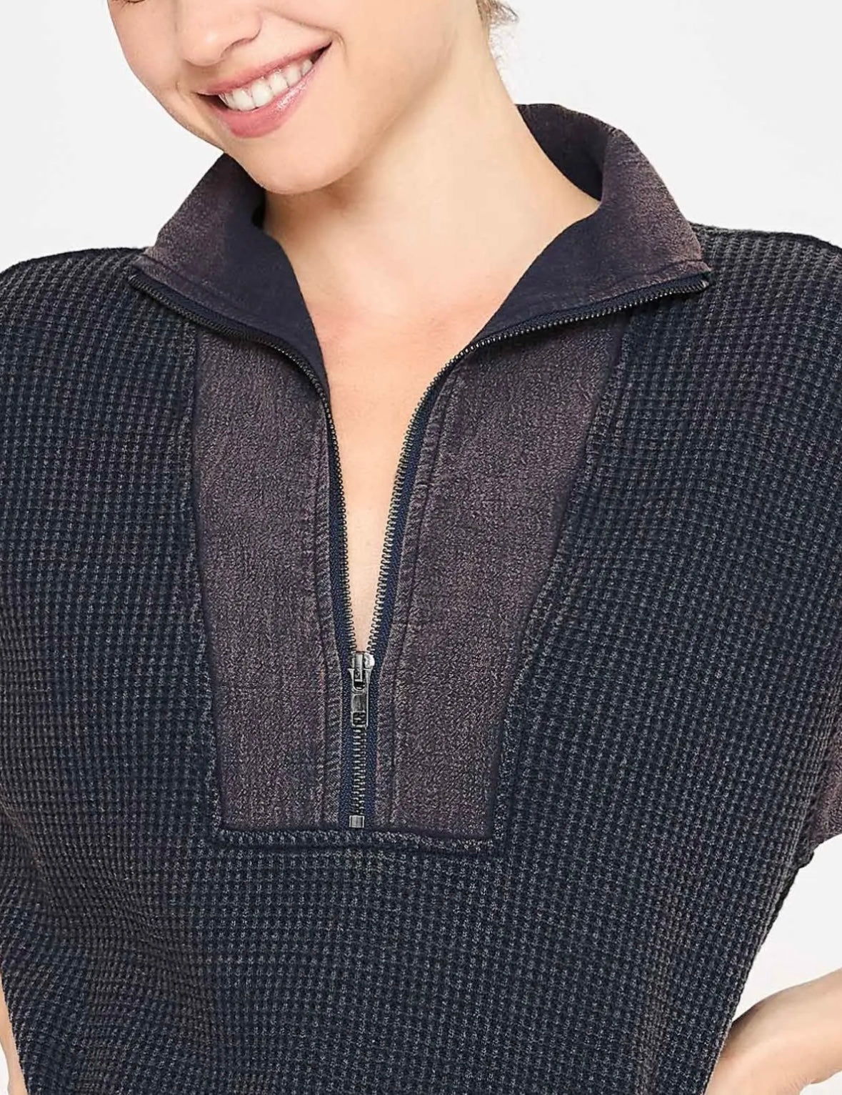 Mineral washed waffle knit dress with half zip up neck and pockets. Unlined. Fits true to size.