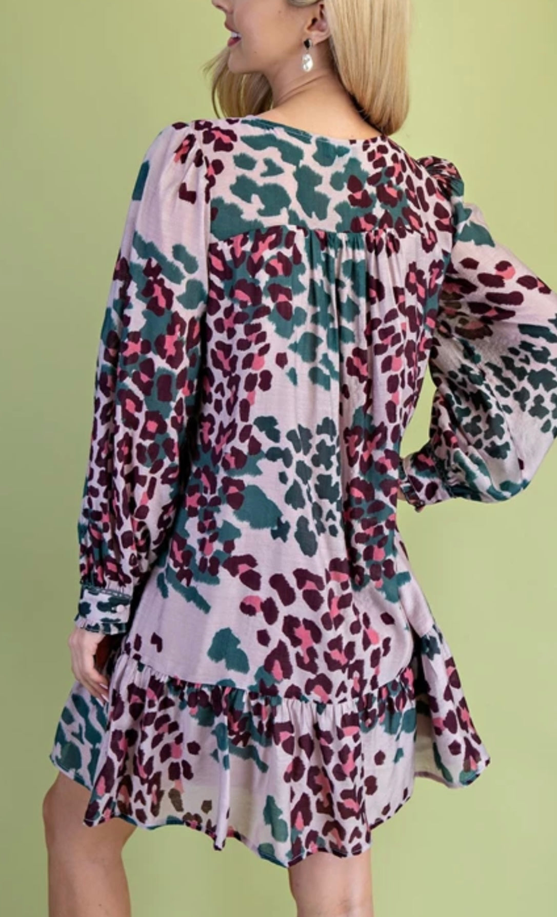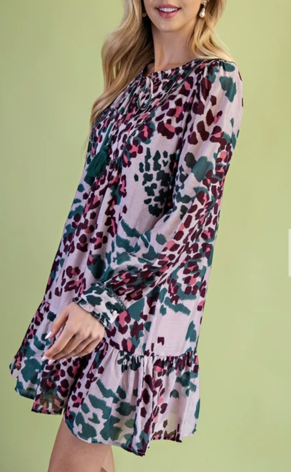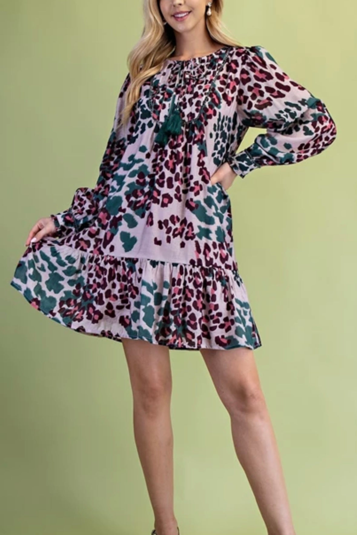 Leopard Print Long Sleeve Dress with Pintuck Details and a Decorative Trim. The Dress is Lined. Fits relaxed but true to size.